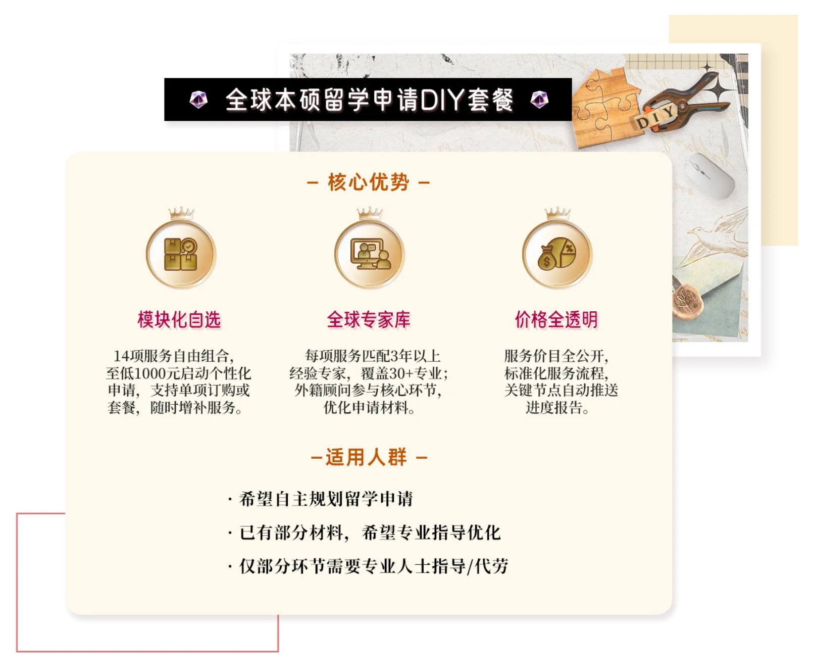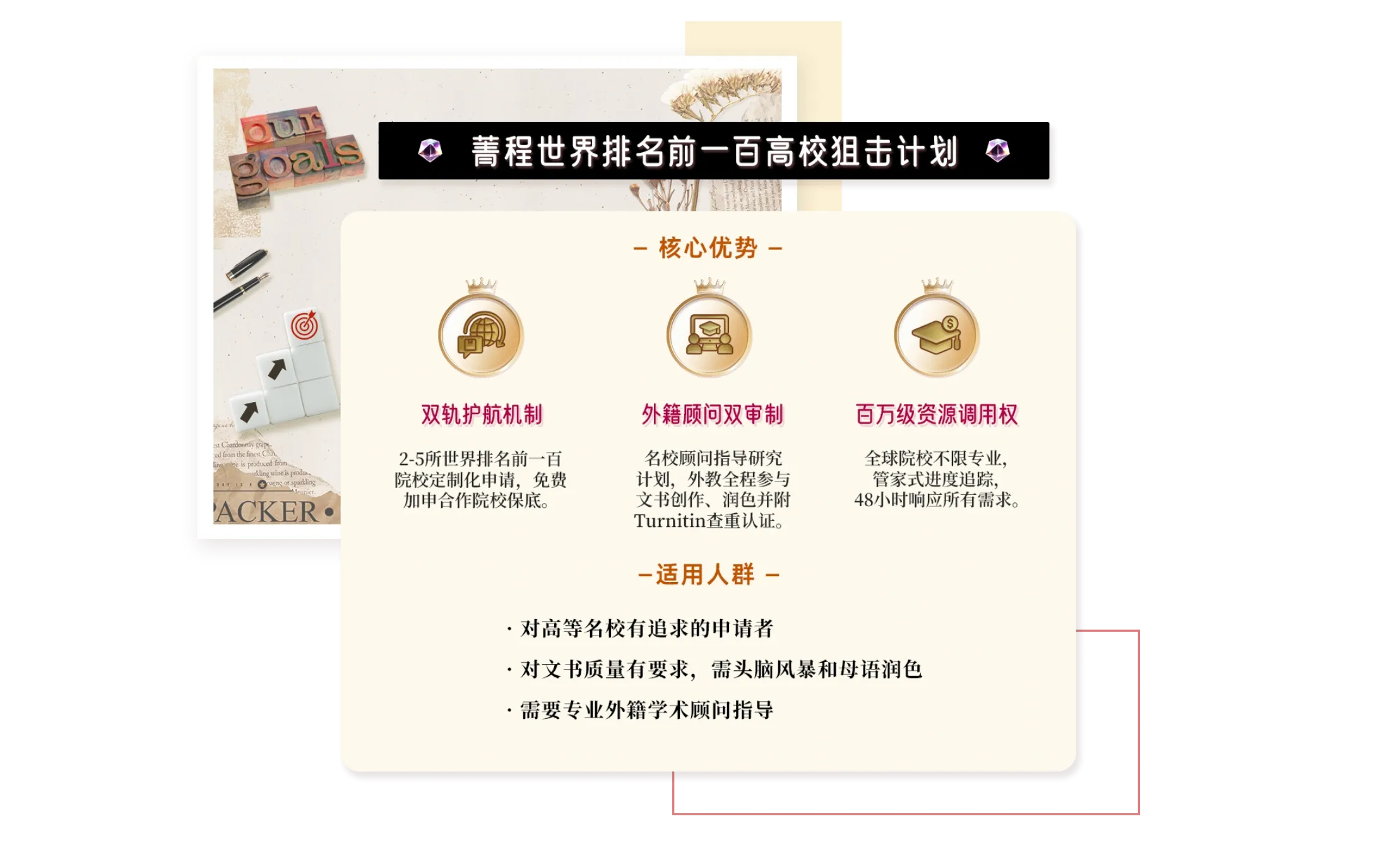 专业团队倾力打造个性化PS、CV及RL,深度挖掘申请者独特亮点,以精准笔触展现核心优势,全方位提升申请竞争力。